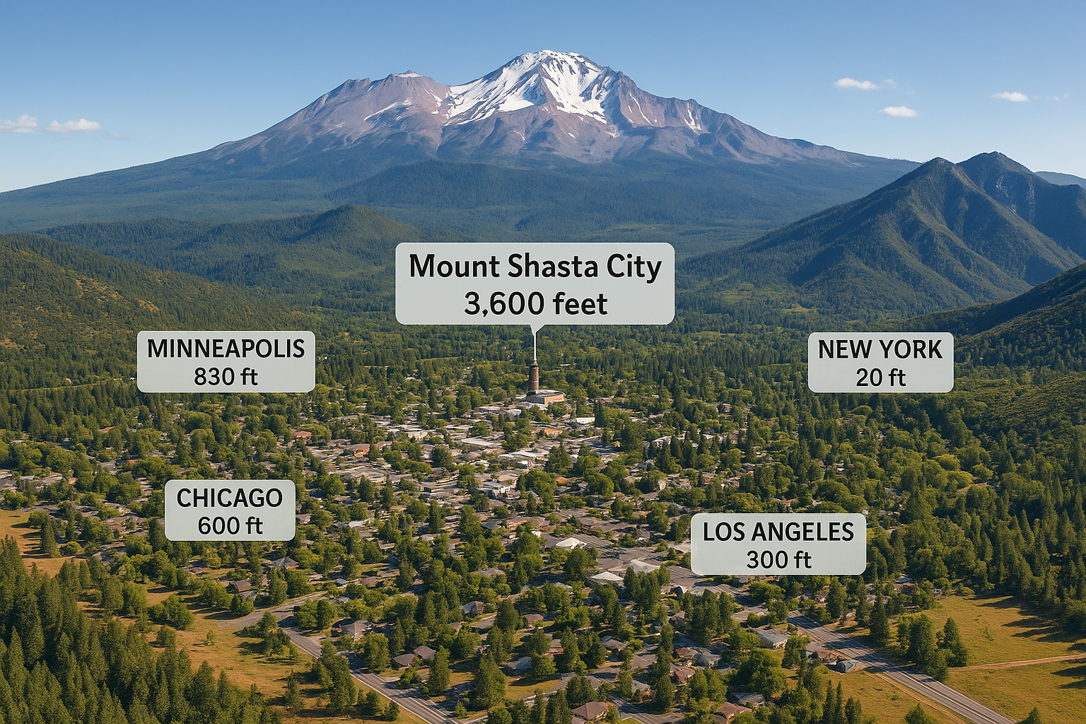 Takeaway: Mount Shasta City at ~3,600 ft is higher than many U.S. coastal cities but lower than high-elevation cities like Denver or Mexico City.